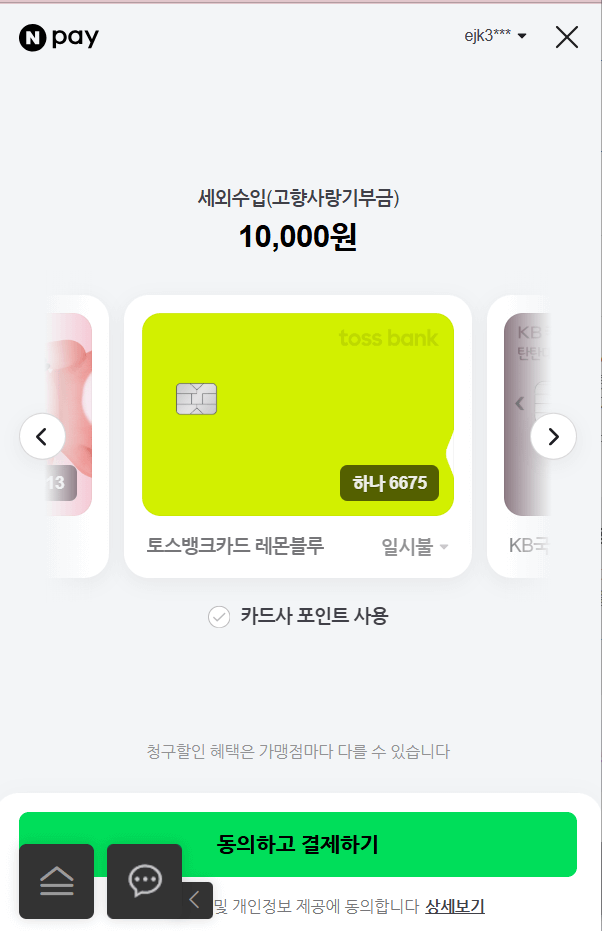 간편결제/계좌이체/신용카드로 바로 납부가 가능합니다. 저는 간편결제에서 네이버 페이를 선택하였습니다. 연락처를 기재하주시면 일반적으로 네이버페이에서 물건을 구매할때처럼 결제를 해주시면 됩니다. 납부 완료 창이 뜨면 기부하기 끝!