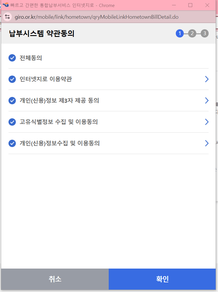 자신이 기부할만큼의 금액을 입력하고 아래로 내려서 확인을 눌러주면 자동으로 세금처럼 부과정보가 등록되었음이 안내됩니다. 바로 납부하러 갈 수 있는데요, 전체 동의를 누르고 확인을 눌러줍니다.